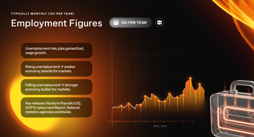 To better understand the events that make up the economic calendar and why traders monitor them, we’ll review some of the most important regularly scheduled events. There are five main groups of events worth paying attention to, although other categories have also become increasingly impactful in recent years.