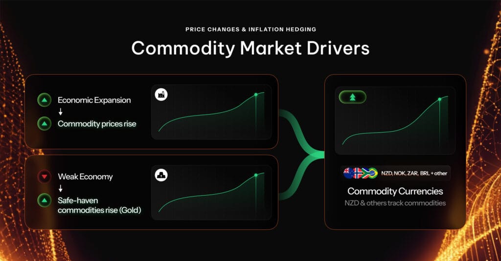 The price of commodities, such as oil, copper, and wheat, tends to rise when the economy expands and demand increases. Thus, the economic calendar can directly impact commodity prices, as well as the valuation of associated futures contracts and commodity-linked ETFs. Some ‘commodity currencies,’ such as the New Zealand dollar (typically linked to agricultural goods), can also be used as tools to bet on the path of commodities.