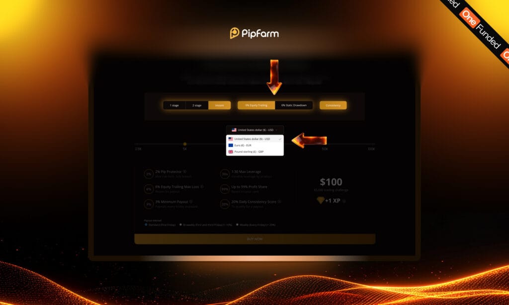 All the risk limits listed below apply to both PipFarm’s trading challenges and funded accounts (with some exceptions due to the firm’s scaling program, which we discuss below). For any of PipFarm’s challenges, traders can choose between an account denominated in USD, GBP, and EUR. For simplicity, this article exclusively uses USD.