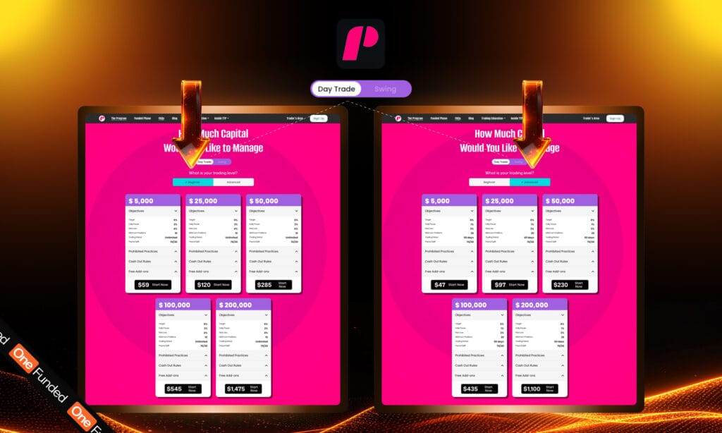 Trade The Pool features a customizable challenge structure. The core decisions a trader needs to make are between the platform’s Day Trade and Swing Trade programs, as well as between Beginner and Advanced trading levels. Unlike other prop firms, Trade The Pool does not offer multi-step evaluations.