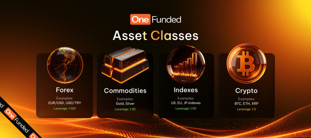 OneFunded’s leverage rules vary by asset class. In forex, traders can access leverage up to 1:100. Commodities and indexes; 1:30. Crypto; 1:2.